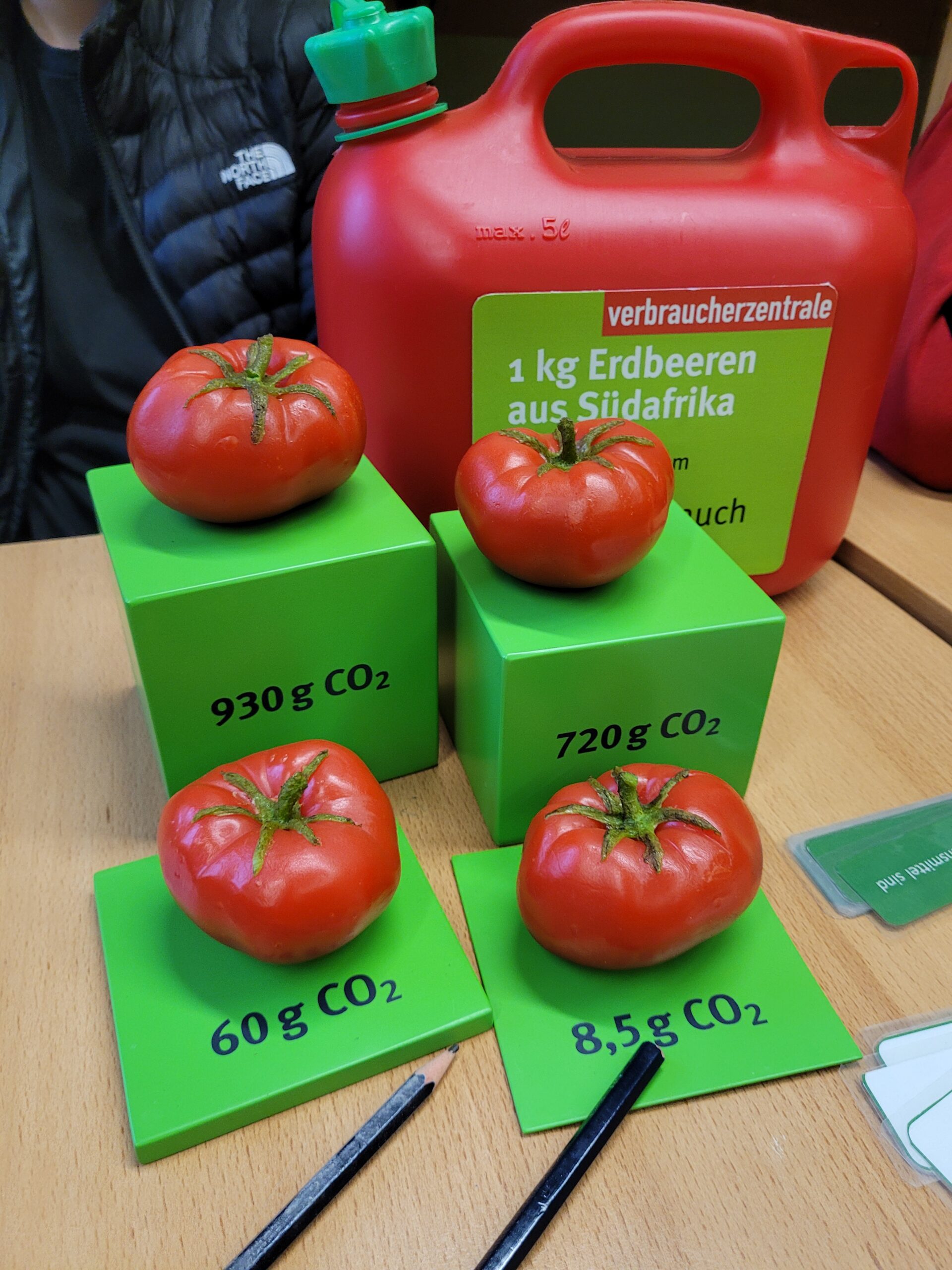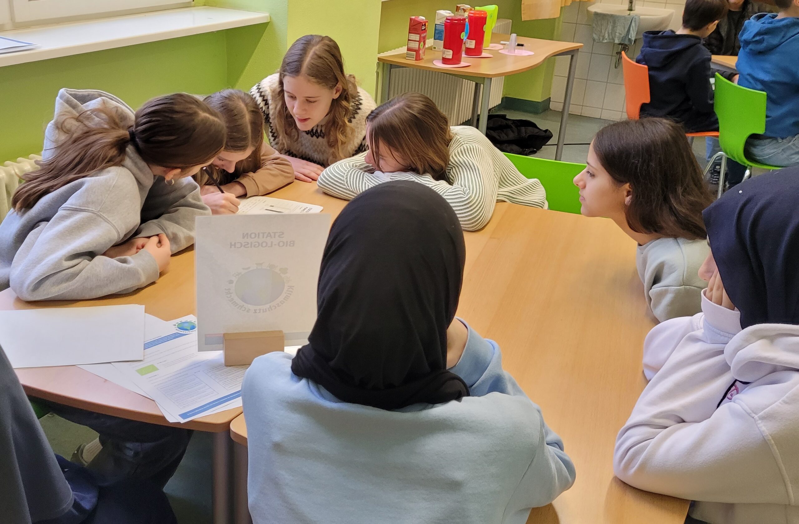 Zwei Klassen beschäftigten sich mit der Klimarelevanz von Lebensmitteln. Dabei untersuchten die Schülerinnen und Schüler den CO2-Abdruck verschiedener Nahrungsmittel und erfuhren, dass insbesondere tierische Produkte einen hohen Anteil an klimaschädlichen Emissionen verursachen. Auch der Vorteil von regionalem und saisonalen Einkäufen wurde kritisch beleuchtet: Nicht alles, was als „regional“ gekennzeichnet ist, ist automatisch klimafreundlich, besonders, wenn es in geheizten Gewächshäusern produziert wird.